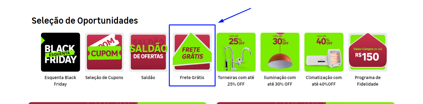 …normalmente elas aparecem nos banners principais da página (home) do site e lá você pode resgatar itens com frete grátis aplicado, basta seguir o passo a passo e clicar em (Frete Grátis) como é mostrado na imagem acima.